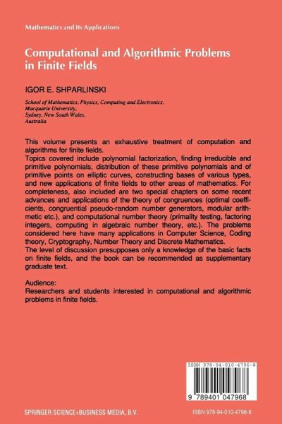 1. Polynomial Factorization.- 1. Univariate factorization.- 2. Multivariate factorization.- 3. Other polynomial decompositions.- 2. Finding irreducible and primitive polynomials.- 1. Construction of irreducible polynomials.- 2. Construction of primitive polynomials.- 3. The distribution of irreducible and primitive polynomials.- 1. Distribution of irreducible and primitive polynomials.- 2. Irreducible and primitive polynomials of a given height and weight.- 3. Sparse polynomials.- 4. Applications to algebraic number fields.- 4. Bases and computation in finite fields.- 1. Construction of some special bases for finite fields.- 2. Discrete logarithm and Zech's logarithm.- 3. Polynomial multiplication and multiplicative complexity in finite fields.- 4. Other algorithms in finite fields.- 5. Coding theory and algebraic curves.- 1. Codes and points on algebraic curves.- 2. Codes and exponential sums.- 3. Codes and lattice packings and coverings.- 6. Elliptic curves.- 1. Some general properties.- 2. Distribution of primitive points on elliptic curves.- 7. Recurrent sequences in finite fields and leyelic linear codes.- 1. Distribution of values of recurrent sequences.- 2. Applications of recurrent sequences.- 3. Cyclic codes and recurrent sequences.- 8. Finite fields and discrete mathematics.- 1. Cryptography and permutation polynomials.- 2. Graph theory, combinatorics, Boolean functions.- 3. Enumeration problems in finite fields.- 9. Congruences.- 1. Optimal coefficients and pseudo-random numbers.- 2. Residues of exponential functions.- 3. Modular arithmetic.- 4. Other applications.- 10. Some related problems.- 1. Integer factorization, primality testing and the greatest common divisor.- 2. Computational algebraic number theory.- 3. Algebraic complexity theory.- 4.Polynomials with integer coefficients.- Appendix 1.- Appendix 2.- Appendix 3.- Addendum.- References.