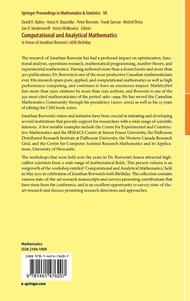The workshops that were held over the years in Dr. Borwein's honor attracted high-caliber scientists from a wide range of mathematical fields. This present volume is an outgrowth of the workshop on 'Computational and Analytical Mathematics' held in May 2011 in celebration of Dr. Borwein's 60th Birthday. The collection contains various state-of-the-art research manuscripts and surveys presenting contributions that have risen from the conference, and is an excellent opportunity to survey state-of-the-art research and discuss promising research directions and approaches.