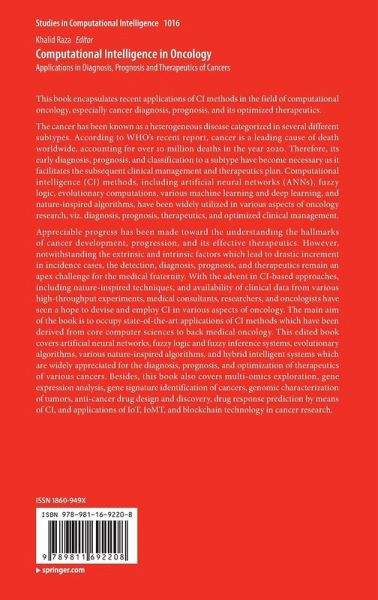 Appreciable progress has been made toward the understanding the hallmarks of cancer development, progression, and its effective therapeutics. However, notwithstanding the extrinsic and intrinsic factors which lead to drastic increment in incidence cases, the detection, diagnosis, prognosis, and therapeutics remain an apex challenge for the medical fraternity. With the advent in CI-based approaches, including nature-inspired techniques, and availability of clinical data from various high-throughput experiments, medical consultants, researchers, and oncologists have seen a hope to devise and employ CI in various aspects of oncology. The main aim of the book is to occupy state-of-the-art applications of CI methods which have been derived from core computer sciences to back medical oncology. This edited book covers artificial neural networks, fuzzy logic and fuzzy inference systems, evolutionary algorithms, various nature-inspired algorithms, and hybrid intelligent systems which are widely appreciated for the diagnosis, prognosis, and optimization of therapeutics of various cancers. Besides, this book also covers multi-omics exploration, gene expression analysis, gene signature identification of cancers, genomic characterization of tumors, anti-cancer drug design and discovery, drug response prediction by means of CI, and applications of IoT, IoMT, and blockchain technology in cancer research.