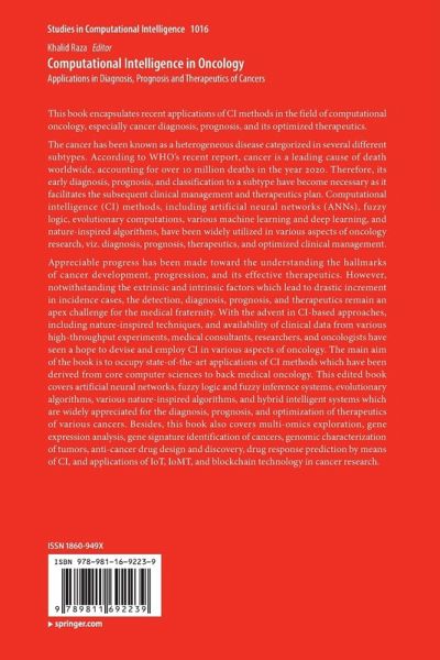 Appreciable progress has been made toward the understanding the hallmarks of cancer development, progression, and its effective therapeutics. However, notwithstanding the extrinsic and intrinsic factors which lead to drastic increment in incidence cases, the detection, diagnosis, prognosis, and therapeutics remain an apex challenge for the medical fraternity. With the advent in CI-based approaches, including nature-inspired techniques, and availability of clinical data from various high-throughput experiments, medical consultants, researchers, and oncologists have seen a hope to devise and employ CI in various aspects of oncology. The main aim of the book is to occupy state-of-the-art applications of CI methods which have been derived from core computer sciences to back medical oncology. This edited book covers artificial neural networks, fuzzy logic and fuzzy inference systems, evolutionary algorithms, various nature-inspired algorithms, and hybrid intelligent systems which are widely appreciated for the diagnosis, prognosis, and optimization of therapeutics of various cancers. Besides, this book also covers multi-omics exploration, gene expression analysis, gene signature identification of cancers, genomic characterization of tumors, anti-cancer drug design and discovery, drug response prediction by means of CI, and applications of IoT, IoMT, and blockchain technology in cancer research.
