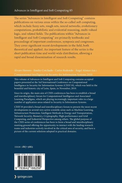 rd The 3 International Conference on Computational Intelligence in Security for Information Systems (CISIS 2010) provided a broad and interdisciplinary forum to present the most recent developments in several very active scientific areas such as Machine Learning, Infrastructure Protection, Intelligent Methods in Energy and Transportation, Network Security, Biometry, Cryptography, High-performance and Grid Computing, and Industrial Perspective among others. The global purpose of CISIS series of conferences has been to form a broad and interdisciplinary meeting ground offering the opportunity to…mehr
