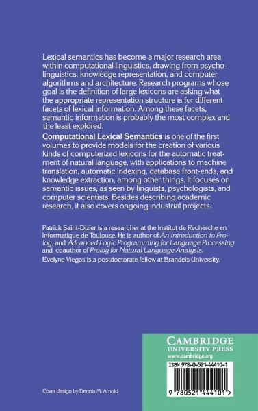 Lexical semantics has become a major research area within computational linguistics, drawing from psycholinguistics, knowledge representation, computer algorithms and architecture. Research programmes whose goal is the definition of large lexicons are asking what the appropriate representation structure is for different facets of lexical information. Among these facets, semantic information is probably the most complex and the least explored. Computational Lexical Semantics is one of the first volumes to provide models for the creation of various kinds of computerized lexicons for the automatic treatment of natural language, with applications to machine translation, automatic indexing, and database front-ends, knowledge extraction, among other things. It focuses on semantic issues, as seen by linguists, psychologists and computer scientists. Besides describing academic research, it also covers ongoing industrial projects.