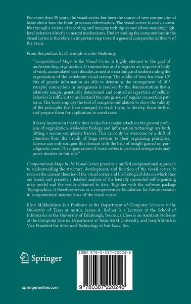 From the reviews: "An increasingly important technique used by basic scientists to understand brain development and function is theoretical/computational modeling. ... Computational Maps in the Visual Cortex provides a good review of this area, though strongly emphasizing the models developed over the past several years by Miikkulainen's group in the Computer Science department at the University of Texas. ... the book will be a useful reference for researchers interested in theoretical approaches for understanding certain properties of the visual cortex." (Geoffrey J. Goodhill, Clinical Experimental Ophthalmology, Issue 34, 2006) "The hardcover book of 24.2×16.3×3 cm size presents a comprehensive, unified computational theory of the visual cortex as a laterally connected self-organizing map ... . All chapters are clearly structured and well written. With more than 170 figures, 47 in full color, the chapters are richly illustrated. ... The book is written for computational scientists and neuroscientists working in the field of the visual cortex. The book will be a valuable complement to every scientific library." (R. M. Müri, Graefe's Archive for Clinical and Experimental Ophthalmology, Vol. 245, 2007)