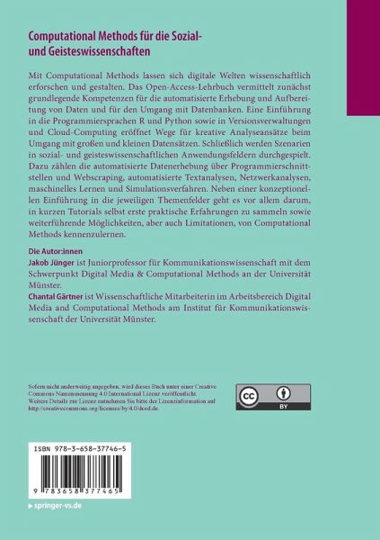 Mit Computational Methods lassen sich digitale Welten wissenschaftlich erforschen und gestalten. Das Open-Access-Lehrbuch vermittelt zunächst grundlegende Kompetenzen für die automatisierte Erhebung und Aufbereitung von Daten und für den Umgang mit Datenbanken. Eine Einführung in die Programmiersprachen R und Python sowie in Versionsverwaltungen und Cloud-Computing eröffnet Wege für kreative Analyseansätze beim Umgang mit großen und kleinen Datensätzen. Schließlich werden Szenarien in sozial- und geisteswissenschaftlichen Anwendungsfeldern durchgespielt. Dazu zählen die automatisierte Datenerhebung über Programmierschnittstellen und Webscraping, automatisierte Textanalysen, Netzwerkanalysen, maschinelles Lernen und Simulationsverfahren. Neben einer konzeptionellen Einführung in die jeweiligen Themenfelder geht es vor allem darum, in kurzen Tutorials selbst erste praktische Erfahrungen zu sammeln sowie weiterführende Möglichkeiten, aber auch Limitationen, von Computational Methodskennenzulernen.