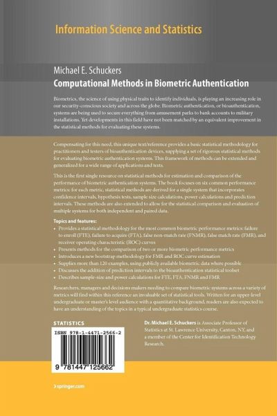 This is the first single resource on statistical methods for estimation and comparison of the performance of biometric authentication systems. The book focuses on six common performance metrics: for each metric, statistical methods are derived for a single system that incorporates confidence intervals, hypothesis tests, sample size calculations, power calculations and prediction intervals. These methods are also extended to allow for the statistical comparison and evaluation of multiple systems for both independent and paired data.