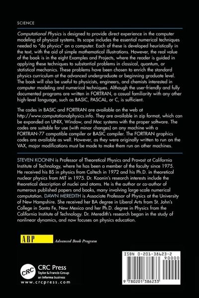Computational Physics is designed to provide direct experience in the computer modeling of physical systems. Its scope includes the essential numerical techniques needed to "do physics" on a computer. Each of these is developed heuristically in the text, with the aid of simple mathematical illustrations. However, the real value of the book is in the eight Examples and Projects, where the reader is guided in applying these techniques to substantial problems in classical, quantum, or statistical mechanics. These problems have been chosen to enrich the standard physics curriculum at the advanced undergraduate or beginning graduate level. The book will also be useful to physicists, engineers, and chemists interested in computer modeling and numerical techniques. Although the user-friendly and fully documented programs are written in FORTRAN, a casual familiarity with any other high-level language, such as BASIC, PASCAL, or C, is sufficient. The codes in BASIC and FORTRAN are available on the web at http://www.computationalphysics.info (Please follow the link at the bottom of the page). They are available in zip format, which can be expanded on UNIX, Window, and Mac systems with the proper software. The codes are suitable for use (with minor changes) on any machine with a FORTRAN-77 compatible compiler or BASIC compiler. The FORTRAN graphics codes are available as well. However, as they were originally written to run on the VAX, major modifications must be made to make them run on other machines.