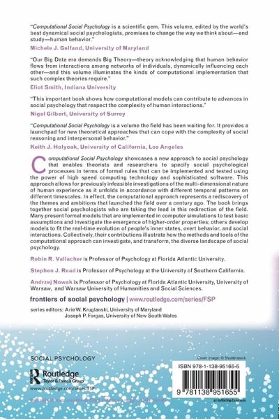 Preface. Overview. 1. Rethinking Human Experience: The Promise of Computational Social Psychology Robin R. Vallacher, Andrzej Nowak, and Stephen J. Read I. Intrapersonal Dynamics 2. Virtual Personalities: A Neural Network Model of the Structure and Dynamics of Personality Stephen J. Read, Vita Droutman, and Lynn C. Miller 3. Using Connectionist Models to Capture the Distinctive Psychological Structure of Impression Formation Brian M. Monroe, Tei Laine, Swati Gupta, and Ilya Farber 4. The Whole Elephant: Toward Psychological Integration of the Individual as a Complex System Jennifer Rose Talevich 5. Computational Modeling of Health Behavior Mark G. Orr and Daniel Chen II. Interpersonal Dynamics 6. Interaction Dominant Dynamics, Timescale Enslavement, and the Emergence of Social Behavior Brian A. Eiler, Rachel W. Kallen, and Michael J. Richardson 7. Computational Temporal Interpersonal Emotion Systems Emily A. Butler, Jinyan Guan, Andrew Predoehl, Ernesto Brau, Kyle Simek, and Kobus Barnard 8. Mapping Co-Regulation in Social Relations through Exploratory Topology Analysis Jonathan E. Butner, Arwen A. Behrends, and Brian R. Baucom 9. Dynamics of Synchrony and Joint Action Kerry L. Marsh 10. From Interaction to Synchronization in Social Relations Robin R. Vallacher and Andrzej Nowak III. Collective Dynamics 11. Simulating the Social Networks in Human Goal Striving James D. Westaby and DaHee Shon 12. Computational Models of Social Influence and Collective Behavior Robert J. MacCoun 13. Modeling Cultural Dynamics Yoshihisa Kashima, Michael Kirley, Alexander Stivala, and Garry Robins 14. Models Are Stupid, and We Need More of Them Paul E. Smaldino 15. Big Data in Psychological Research David Serfass, Andrzej Nowak, and Ryne Sherman 16. The Future of Computational Social Psychology Andrzej Nowak and Robin R. Vallacher