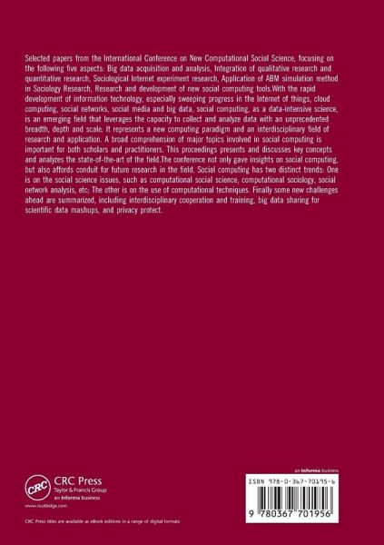 Selected papers from the International Conference on New Computational Social Science, focusing on the following five aspects: Big data acquisition and analysis, Integration of qualitative research and quantitative research, Sociological Internet experiment research, Application of ABM simulation method in Sociology Research, Research and development of new social computing tools. With the rapid development of information technology, especially sweeping progress in the Internet of things, cloud computing, social networks, social media and big data, social computing, as a data-intensive science, is an emerging field that leverages the capacity to collect and analyze data with an unprecedented breadth, depth and scale. It represents a new computing paradigm and an interdisciplinary field of research and application. A broad comprehension of major topics involved in social computing is important for both scholars and practitioners. This proceedings presents and discusses key concepts and analyzes the state-of-the-art of the field. The conference not only gave insights on social computing, but also affords conduit for future research in the field. Social computing has two distinct trends: One is on the social science issues, such as computational social science, computational sociology, social network analysis, etc; The other is on the use of computational techniques. Finally some new challenges ahead are summarized, including interdisciplinary cooperation and training, big data sharing for scientific data mashups, and privacy protect.