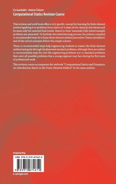 This revision and work book offers a very specific concept for learning the finite element method applying it to problems from statics of: It skips all the classical derivations and focusses only the essential final results. Based on these `essentials', fully solved example problems are presented. To facilitate the initial learning process, the authors compiled 10 recommended steps for a linear finite element solution procedure (`hand calculation') and all the solved examples follow this simple scheme.