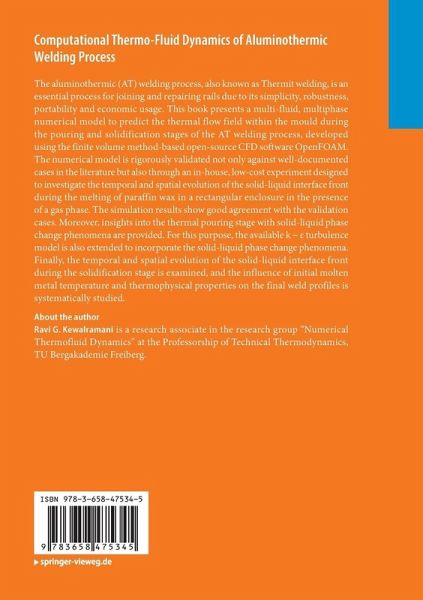 The aluminothermic (AT) welding process, also known as Thermit welding, is an essential process for joining and repairing rails due to its simplicity, robustness, portability and economic usage. This book presents a multi-fluid, multiphase numerical model to predict the thermal flow field within the mould during the pouring and solidification stages of the AT welding process, developed using the finite volume method-based open-source CFD software OpenFOAM. The numerical model is rigorously validated not only against well-documented cases in the literature but also through an in-house, low-cost experiment designed to investigate the temporal and spatial evolution of the solid-liquid interface front during the melting of paraffin wax in a rectangular enclosure in the presence of a gas phase. The simulation results show good agreement with the validation cases. Moreover, insights into the thermal pouring stage with solid-liquid phase change phenomena are provided. For this purpose, the available k turbulence model is also extended to incorporate the solid-liquid phase change phenomena. Finally, the temporal and spatial evolution of the solid-liquid interface front during the solidification stage is examined, and the influence of initial molten metal temperature and thermophysical properties on the final weld profiles is systematically studied.