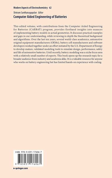 This edited volume, with contributions from the Computer Aided Engineering for Batteries (CAEBAT) program, provides firsthand insights into nuances of implementing battery models in actual geometries. It discusses practical examples and gaps in our understanding, while reviewing in depth the theoretical background and algorithms. Over the last ten years, several world-class academics, automotive original equipment manufacturers (OEMs), battery cell manufacturers and software developers worked together under an effort initiated by the U.S. Department of Energy to develop mature, validated modeling tools to simulate design, performance, safety and life of automotive batteries. Until recently, battery modeling was a niche focus area with a relatively small number of experts. This book opens up the research topic for a broader audience from industry and academia alike. It is a valuable resource for anyone who works on battery engineering but has limited hands-on experience with coding.