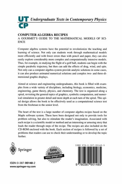 Computer algebra systems have the potential to revolutionize the teaching of and learning of science. Not only can students work thorough mathematical models much more efficiently and with fewer errors than with pencil and paper, they can also work with much more complex and computationally intensive models. Thus, for example, in studying the flight of a golf ball, students can begin with the simple parabolic trajectory, but then add the effects of lift and drag, of winds, and of spin. Not only can the program provide analytic solutions in some cases, it can also produce numerical solutions and graphic displays. Aimed at undergraduates in their second or third year, this book is filled with examples from a wide variety of disciplines, including biology, economics, medicine, engineering, game theory, physics, chemistry. The text is organized along a spiral, revisiting general topics such as graphics, symbolic computation, and numerical simulation in greater detail and more depth at each turn of the spiral.The heart of the text is a large number of computer algebra recipes. These have been designed not only to provide tools for problem solving, but also to stimulate the reader's imagination. Associated with each recipe is a scientific model or method and a story that leads the reader through steps of the recipe. The recipes are also included on the CD-ROM enclosed with the book. Each section of recipes is followed by a set of problems that readers can use to check their understanding or to develop the topic further.