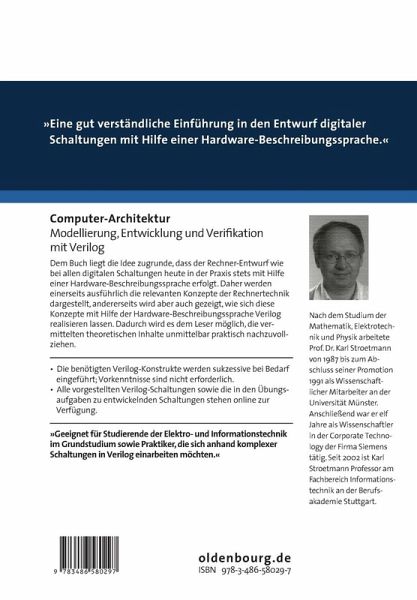 Das Buch beginnt mit der Beschreibung eines einfachen RISC-Prozessors. Anschließend werden die Hardwareaspekte der benötigten Rechenwerke und sequentielle Schaltungen vorgestellt und mit Verilog modelliert, bevor eine komplette CPU entworfen wird. Schließlich liegt eine Beschreibung des anfänglich vorgestellten RISC-Prozessors auf Gatter-Ebene vor. Die folgenden Kapitel behandeln komplexere Rechnersysteme. CISC-Prozessoren und leistungsfähigere Assembler wie JAVA-Bytecode und Mikroassembler für die Interpretation der Rechnerbefehle der CISC-Maschine werden vorgestellt und mit Verilog modelliert. Die benötigten Konstrukte von Verilog werden im Buch Zug um Zug eingeführt. Methoden zum Rechnen mit Fließkommazahlen nach dem IEEE-754-Standard sowie Algorithmen in Verilog zur Addition und Multiplikation solcher Zahlen vervollständigen das Buch.