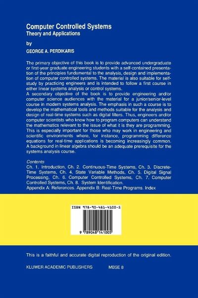 The primary objective of the book is to provide advanced undergraduate or frrst-year graduate engineering students with a self-contained presentation of the principles fundamental to the analysis, design and implementation of computer controlled systems. The material is also suitable for self-study by practicing engineers and is intended to follow a first course in either linear systems analysis or control systerns. A secondary objective of the book is to provide engineering and/or computer science audiences with the material for a junior/senior-level course in modern systems analysis. Chapters 2, 3, 4, and 5 have been designed with this purposein rnind. The emphasis in such a course is to develop the rnathernatical tools and methods suitable for the analysis and design of real-time systems such as digital filters. Thus, engineers and/or computer scientists who know how to program computers can understand the mathematics relevant to the issue of what it is they are programrning. This is especially important for those who may work in engineering and scientific environments where, for instance, programrning difference equations for real-time applications is becorning increasingly common. A background in linear algebra should be an adequate prerequisite for the systems analysis course. Chapter 1 of the book presents a brief introduction to computer controlled systems. It describes the general issues and terminology relevant to the analysis, design, and implementation of such systems.