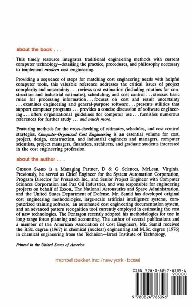 GIDEON SAMID is a Managing Partner, D & G Sciences, McLean, Virginia. Previously, he served as Chief Engineer for the System Automation Corporation, Program Director for Research Inc., and Senior Project Engineer with Computer Sciences Corporation and Paz Oil Industries, and was responsible for engineering projects on behalf of Exxon, The National Aeronautics and Space Administration, and the United States Department of Defense. Mr. Samid has developed original cost engineering methodologies, large-scale artificial intelligence systems, computerized training software, an automated cost engineering documentation system, and an advanced pattern recognition tool currently employed in estimating the cost of new technologies. The Pentagon recently adopted his methodologies for use in long-range force planning and accounting. The author of several publications and a member of the American Association of Cost Engineers, Mr. Samid received the B.Sc. degree (1967) in chemical (nuclear) engineering and M.Sc. degree (1976) in chemical engineering from the Technion-Israel Institute of Technology.