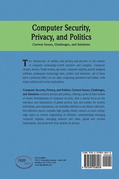 The intersection of politics, law, privacy, and security in the context of computer technology is both sensitive and complex. Computer viruses, worms, Trojan horses, spy-ware, computer exploits, poorly designed software, inadequate technology laws, politics and terrorism-all of these have a profound effect on our daily computing operations and habits, with major political and social implications. Computer Security, Privacy and Politics: Current Issues, Challenges and Solutions connects privacy and politics, offering a point-in-time review of recent developments of computer security, with a special focus on the relevance and implications of global privacy, law, and politics for society, individuals, and corporations. An estimable addition to any library collection, this reference source compiles high quality, timely content on such cutting-edge topics as reverse engineering of software, understanding emerging computer exploits, emerging lawsuits and cases, global and societal implications, and protection from attacks on privacy.