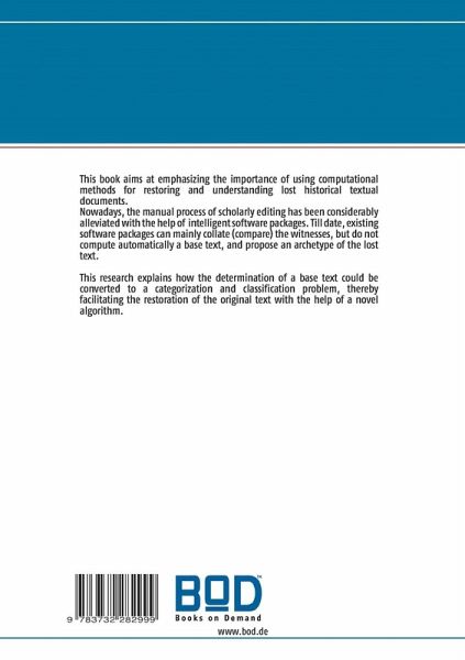 This book aims at emphasizing the importance of using computational methods for restoring and understanding lost historical textual documents. Historical textual documents, whether they are simple stories, or religious scriptures, or even scientific writings, can be reasonably reconstructed with the help of computational techniques.Nowadays, the manual process of scholarly editing has been considerably alleviated with the help of intelligent software packages. Till date, existing software packages can mainly collate (compare) the witnesses, but do not compute automatically a base text, and propose an archetype of the lost text.This research explains how the determination of a base text could be converted to a categorization and classification problem, thereby facilitating the restoration of the original text with the help of a novel algorithm.