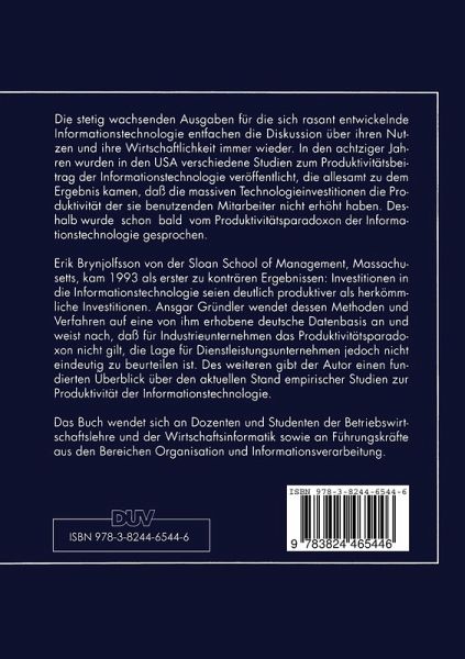 Die stetig wachsenden Ausgaben für die sich rasant entwickelnde Informationstechnologie entfachen die Diskussion über ihren Nutzen und ihre Wirtschaftlichkeit immer wieder. In den achtziger Jahren wurden in den USA verschiedene Studien zum Produktivitätsbeitrag der Informationstechnologie veröffentlicht, die allesamt zu dem Ergebnis kamen, daß die massiven Technologieinvestitionen die Produktivität der sie benutzenden Mitarbeiter nicht erhöht haben. Deshalb wurde schon bald vom Produktivitätsparadoxon der Informationstechnologie gesprochen. Prof. Erik Brynjolfsson von der Sloan School of Management, Massachusetts, kam 1993 als erster zu konträren Ergebnissen: Investitionen in die Informationstechnologie seien deutlich produktiver als herkömmliche Investitionen. Ansgar Gründler wendet dessen Methoden und Verfahren auf eine von ihm erhobene deutsche Datenbasis an und weist nach, daß für Industrieunternehmen das Produktivitätsparadoxon nicht gilt, die Lage für Dienstleistungsunternehmen jedoch nicht eindeutig zu beurteilen ist. Des weiteren gibt der Autor einen fundierten Überblick über den aktuellen Stand empirischer Studien zur Produktivität der Informationstechnologie.