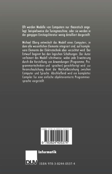 Michael Oberg entwickelt das Modell eines Computers, in dem alle wesentlichen Elemente integriert sind, auf komplexere Elemente der Elektrotechnik aber verzichtet wird. Der Entwurf beginnt bei den logischen Schaltungen. Der Autor verfeinert das Modell schrittweise, wobei jede Erweiterung durch die Vorstellung von Anwendungen (Programme, Programmiertechniken und -sprachen) gerechtfertigt wird; zur Veranschaulichung dient die Wechselbeziehung zwischen Computer und Sprache. Abschließend wird ein kompletter Compiler für eine einfache objektorientierte Programmiersprache vorgestellt.