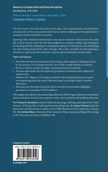 The first book of its kind devoted to this topic, this comprehensive text/reference presents state-of-the-art research and reviews current challenges in the application of computer vision to problems in sports. Opening with a detailed introduction to the use of computer vision across the entire life-cycle of a sports event, the text then progresses to examine cutting-edge techniques for tracking the ball, obtaining the whereabouts and pose of the players, and identifying the sport being played from video footage. The work concludes by investigating a selection of systems for the automatic analysis and classification of sports play. The insights provided by this pioneering collection will be of great interest to researchers and practitioners involved in computer vision, sports analysis and media production.