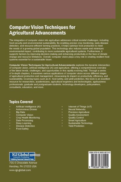 The integration of computer vision into agriculture addresses critical societal challenges, including food security and environmental sustainability. By enabling precise crop monitoring, early disease detection, and resource-efficient farming practices, it helps optimize food production to meet the needs of a growing global population. This technology also reduces waste and minimizes environmental impact, contributing to more sustainable agricultural systems. Furthermore, it supports farmers by improving decision-making and enhancing productivity in the face of climate change and resource limitations. Overall, computer vision plays a key role in creating resilient food systems essential for a sustainable future. Computer Vision Techniques for Agricultural Advancements explores the dynamic intersection of computer vision, artificial intelligence (AI) and agriculture, offering a comprehensive overview of the latest trends, challenges, and opportunities in this rapidly evolving field. Through a series of in-depth chapters, it examines various applications of computer vision across different stages of agricultural production and management, showcasing its impact on productivity, efficiency, and sustainability. Covering topics such as AI, food safety, and yield prediction, this book is an excellent resource for researchers, academicians, agricultural engineers and technologists, agribusiness professionals, graduate and postgraduate students, technology developers, policymakers, consultants, educators, and more.