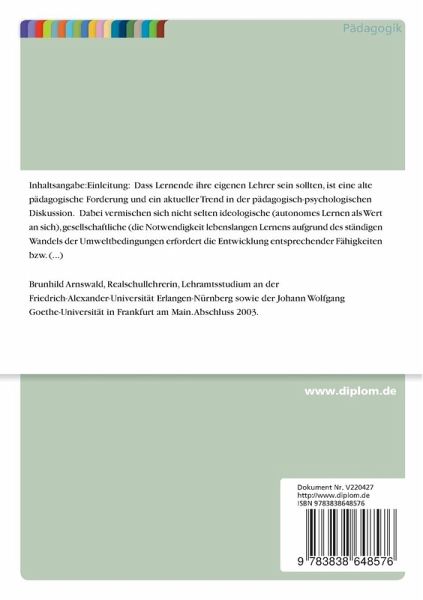Examensarbeit aus dem Jahr 2001 im Fachbereich Pädagogik - Schulpädagogik, Note: 1,0, Friedrich-Alexander-Universität Erlangen-Nürnberg (Psychologie), Sprache: Deutsch, Abstract: Inhaltsangabe:Einleitung: Dass Lernende ihre eigenen Lehrer sein sollten, ist eine alte pädagogische Forderung und ein aktueller Trend in der pädagogisch-psychologischen Diskussion. Dabei vermischen sich nicht selten ideologische (autonomes Lernen als Wert an sich), gesellschaftliche (die Notwendigkeit lebenslangen Lernens aufgrund des ständigen Wandels der Umweltbedingungen erfordert die Entwicklung entsprechender Fähigkeiten bzw. Schlüsselqualifikationen) und pädagogisch-psychologische Argumente (günstige kognitive, motivationale und volitionale Rückwirkungen dieser Methode auf den Lernenden).
