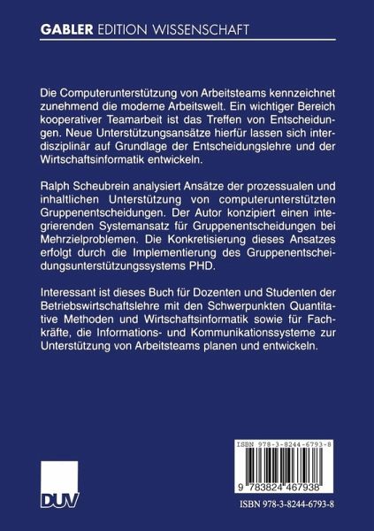 Die Computerunterstützung von Arbeitsteams kennzeichnet zunehmend die moderne Arbeitswelt. Ein wichtiger Bereich kooperativer Teamarbeit ist das Treffen von Entscheidungen. Neue Unterstützungsansätze hierfür lassen sich interdisziplinär auf Grundlage der Entscheidungslehre und der Wirtschaftsinformatik entwickeln. Ralph Scheubrein analysiert Ansätze der prozessualen und inhaltlichen Unterstützung von computerunterstützten Gruppenentscheidungen. Der Autor konzipiert einen integrierenden Systemansatz für Gruppenentscheidungen bei Mehrzielproblemen. Die Konkretisierung dieses Ansatzes erfolgt durch die Implementierung des Gruppenentscheidungsunterstützungssystems PHD.