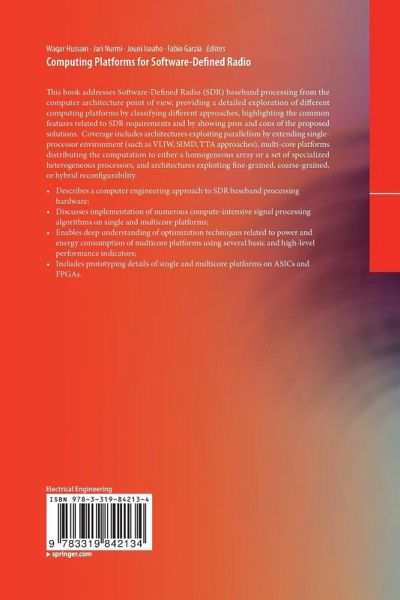 This book addresses Software-Defined Radio (SDR) baseband processing from the computer architecture point of view, providing a detailed exploration of different computing platforms by classifying different approaches, highlighting the common features related to SDR requirements and by showing pros and cons of the proposed solutions. It covers architectures exploiting parallelism by extending single-processor environment (such as VLIW, SIMD, TTA approaches), multi-core platforms distributing the computation to either a homogeneous array or a set of specialized heterogeneous processors, and architectures exploiting fine-grained, coarse-grained, or hybrid reconfigurability.