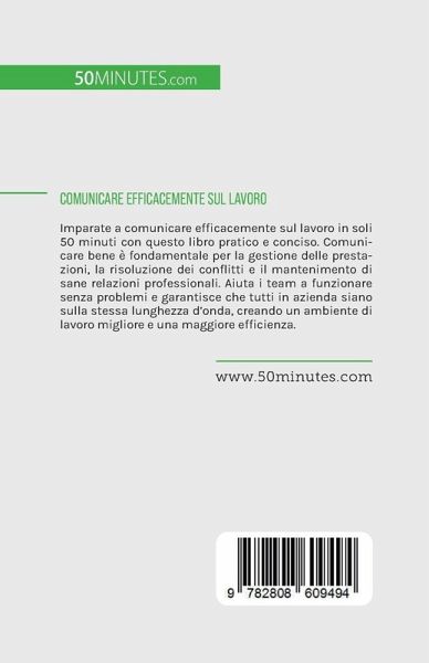 Imparate a comunicare efficacemente sul lavoro in soli 50 minuti con questo libro pratico e conciso. Comunicare bene è fondamentale per la gestione delle prestazioni, la risoluzione dei conflitti e il mantenimento di sane relazioni professionali. Aiuta i team a funzionare senza problemi e garantisce che tutti in azienda siano sulla stessa lunghezza d'onda, creando un ambiente di lavoro migliore e una maggiore efficienza. In questo libro imparerete come una migliore comunicazione possa aiutarvi nel lavoro di squadra, nei colloqui di lavoro e nel parlare in pubblico. Include inoltre consigli utili per adattare il proprio stile di comunicazione al pubblico e suggerimenti sul linguaggio del corpo, fornendo tutto ciò che serve per diventare un grande comunicatore!