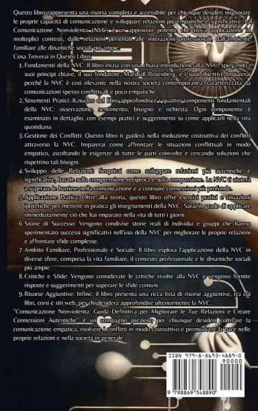 Questo libro rappresenta una risorsa completa e accessibile per chiunque desideri migliorare le proprie capacità di comunicazione e sviluppare relazioni più empatiche e significative. La Comunicazione Nonviolenta (NVC) è un approccio potente che trova applicazione in molteplici contesti, dalle relazioni personali alle interazioni professionali, dall'ambiente familiare alle dinamiche sociali più ampie. Cosa Troverai in Questo Libro:Fondamenti della NVC: Il libro inizia con una chiara introduzione alla NVC, spiegando i suoi principi chiave, il suo fondatore, Marshall Rosenberg, e i suoi obiettivi. Imparerai perché la NVC è così rilevante nella nostra società contemporanea, caratterizzata da comunicazioni spesso conflittuali e poco empatiche. Strumenti Pratici: Il nucleo del libro approfondisce i quattro componenti fondamentali della NVC: osservazione, sentimento, bisogno e richiesta. Ogni componente è esaminato in dettaglio, con esempi pratici e suggerimenti su come applicarli nella vita quotidiana. Gestione dei Conflitti: Questo libro ti guiderà nella risoluzione costruttiva dei conflitti attraverso la NVC. Imparerai come affrontare le situazioni conflittuali in modo empatico, ascoltando le esigenze di tutte le parti coinvolte e cercando soluzioni che rispettino tali bisogni. Sviluppo delle Relazioni: Scoprirai come sviluppare relazioni più autentiche e significative, basate sulla comprensione reciproca e sulla compassione. La NVC ti aiuterà a superare le barriere nella comunicazione e a costruire connessioni più profonde. Applicazione Pratica: Oltre alla teoria, questo libro offre esercizi pratici e situazioni ipotetiche per mettere in pratica gli insegnamenti della NVC. Sarai in grado di applicare immediatamente ciò che hai imparato nella vita di tutti i giorni. Storie di Successo: Vengono condivise storie reali di individui e gruppi che hanno sperimentato successi significativi nell'uso della NVC per migliorare le proprie relazioni e affrontare sfide complesse. Ambito Familiare, Professionale e Sociale: Il libro esplora l'applicazione della NVC in diverse sfere, compresa la vita familiare, il contesto professionale e le dinamiche sociali più ampie. Critiche e Sfide: Vengono considerate le critiche rivolte alla NVC e vengono fornite risposte e suggerimenti per superare le sfide comuni. Risorse Aggiuntive: Infine, il libro presenta una ricca lista di risorse aggiuntive, tra cui libri, corsi e siti web, per chi desidera approfondire ulteriormente la NVC. "Comunicazione Nonviolenta: Guida Definitiva per Migliorare le Tue Relazioni e Creare Connessioni Autentiche" è un compagno prezioso per chiunque desideri coltivare la comunicazione empatica, risolvere i conflitti in modo costruttivo e promuovere la pace nelle proprie relazioni e nella società in generale.
