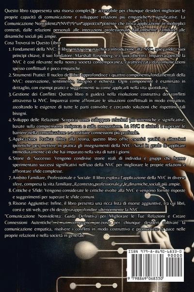 Questo libro rappresenta una risorsa completa e accessibile per chiunque desideri migliorare le proprie capacità di comunicazione e sviluppare relazioni più empatiche e significative. La Comunicazione Nonviolenta (NVC) è un approccio potente che trova applicazione in molteplici contesti, dalle relazioni personali alle interazioni professionali, dall'ambiente familiare alle dinamiche sociali più ampie. Cosa Troverai in Questo Libro:Fondamenti della NVC: Il libro inizia con una chiara introduzione alla NVC, spiegando i suoi principi chiave, il suo fondatore, Marshall Rosenberg, e i suoi obiettivi. Imparerai perché la NVC è così rilevante nella nostra società contemporanea, caratterizzata da comunicazioni spesso conflittuali e poco empatiche. Strumenti Pratici: Il nucleo del libro approfondisce i quattro componenti fondamentali della NVC: osservazione, sentimento, bisogno e richiesta. Ogni componente è esaminato in dettaglio, con esempi pratici e suggerimenti su come applicarli nella vita quotidiana. Gestione dei Conflitti: Questo libro ti guiderà nella risoluzione costruttiva dei conflitti attraverso la NVC. Imparerai come affrontare le situazioni conflittuali in modo empatico, ascoltando le esigenze di tutte le parti coinvolte e cercando soluzioni che rispettino tali bisogni. Sviluppo delle Relazioni: Scoprirai come sviluppare relazioni più autentiche e significative, basate sulla comprensione reciproca e sulla compassione. La NVC ti aiuterà a superare le barriere nella comunicazione e a costruire connessioni più profonde. Applicazione Pratica: Oltre alla teoria, questo libro offre esercizi pratici e situazioni ipotetiche per mettere in pratica gli insegnamenti della NVC. Sarai in grado di applicare immediatamente ciò che hai imparato nella vita di tutti i giorni. Storie di Successo: Vengono condivise storie reali di individui e gruppi che hanno sperimentato successi significativi nell'uso della NVC per migliorare le proprie relazioni e affrontare sfide complesse. Ambito Familiare, Professionale e Sociale: Il libro esplora l'applicazione della NVC in diverse sfere, compresa la vita familiare, il contesto professionale e le dinamiche sociali più ampie. Critiche e Sfide: Vengono considerate le critiche rivolte alla NVC e vengono fornite risposte e suggerimenti per superare le sfide comuni. Risorse Aggiuntive: Infine, il libro presenta una ricca lista di risorse aggiuntive, tra cui libri, corsi e siti web, per chi desidera approfondire ulteriormente la NVC. "Comunicazione Nonviolenta: Guida Definitiva per Migliorare le Tue Relazioni e Creare Connessioni Autentiche" è un compagno prezioso per chiunque desideri coltivare la comunicazione empatica, risolvere i conflitti in modo costruttivo e promuovere la pace nelle proprie relazioni e nella società in generale.