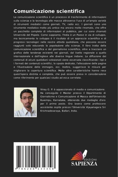 La comunicazione scientifica è un processo di trasferimento di informazioni sulla scienza e la tecnologia alle masse attraverso l'uso di un'ampia varietà di strumenti mediatici come giornali, TV, radio ecc. I giornali sono uno strumento mediatico molto più antico ma ancora molto rinomato, che offre un pacchetto completo di informazioni al pubblico, per cui sono chiamati Università del Popolo. Come sappiamo, l'India è un Paese in via di sviluppo, ma tecnicamente lo sviluppo è il risultato di un approccio scientifico e di progressi tecnologici nelle nostre attività quotidiane, che possono essere raggiunti solo educando la popolazione alla scienza. Il libro tratta della comunicazione scientifica e del giornalismo scientifico, oltre a tracciare un grafico delle tendenze esistenti nei giornali, dal livello regionale a quello internazionale e dall'inglese alle diverse lingue indiane. La diffusione dei contenuti di alcuni quotidiani selezionati viene osservata classificando i tipi e i formati dei contenuti scientifici, lo spazio dedicato, l'allocazione delle pagine e l'illustrazione delle immagini, ecc. Inoltre, suggerisce le misure per migliorare la copertura scientifica. Molte altre caratteristiche hanno reso quest'opera distinta e completa, che può essere presa in considerazione come riferimento per qualsiasi studio ad essa correlato.