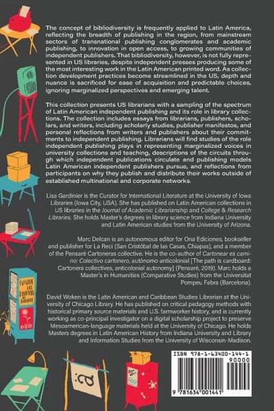 The concept of bibliodiversity is frequently applied to Latin America, reflecting the breadth of publishing in the region, from mainstream sectors of transnational publishing conglomerates and academic publishing, to innovation in open access, to growing communities of independent publishers. That bibliodiversity, however, is not fully represented in US libraries, despite independent presses producing some of the most interesting work in the Latin American printed word. As collection development practices become streamlined in the US, depth and nuance is sacrificed for ease of acquisition and predictable choices, ignoring marginalized perspectives and emerging talent. This collection presents US librarians with a sampling of the spectrum of Latin American independent publishing and its role in library collections. The collection includes essays from librarians, publishers, scholars, and writers, including scholarly studies, publisher manifestos, and personal reflections from writers and publishers about their commitments to independent publishing. Librarians will find studies of the role independent publishing plays in representing marginalized voices in university collections and teaching, descriptions of the circuits through which independent publications circulate and publishing models Latin American independent publishers pursue, and reflections from participants on why they publish and distribute their works outside of established multinational and corporate networks. Lisa Gardinier is the Curator for International Literature at the University of Iowa Libraries (Iowa City, USA). She has published on Latin American collections in US libraries in the Journal of Academic Librarianship and College & Research Libraries. She holds Master's degrees in library science from Indiana University and Latin American studies from the University of Arizona. Marc Delcan is an autonomous editor for Ona Ediciones, bookseller and publisher for La Reci (San Cristóbal de las Casas, Chiapas), and a member of the Pensaré Cartoneras collective. He is the co-author of Cartonear es camino: Colectivo cartonero, autónomo anticolonial [The path is cardboard: Cartonera collectives, anticolonial autonomy] (Pensaré, 2019). Marc holds a Master's in Humanities (Comparative Studies) from the Universitat Pompeu Fabra (Barcelona). David Woken is the Latin American and Caribbean Studies Librarian at the University of Chicago Library. He has published on critical pedagogy methods with historical primary source materials and U.S. farmworker history, and is currently working as co-principal investigator on a digital scholarship project to preserve Mesoamerican-language materials held at the University of Chicago. He holds Masters degrees in Latin American History from Indiana University and Library and Information Studies from the University of Wisconsin-Madison.