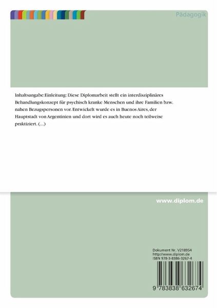 Diese Diplomarbeit stellt ein interdisziplinäres Behandlungskonzept für psychisch kranke Menschen und ihre Familien bzw. nahen Bezugspersonen vor. Entwickelt wurde es in Buenos Aires, der Hauptstadt von Argentinien und dort wird es auch heute noch teilweise praktiziert.