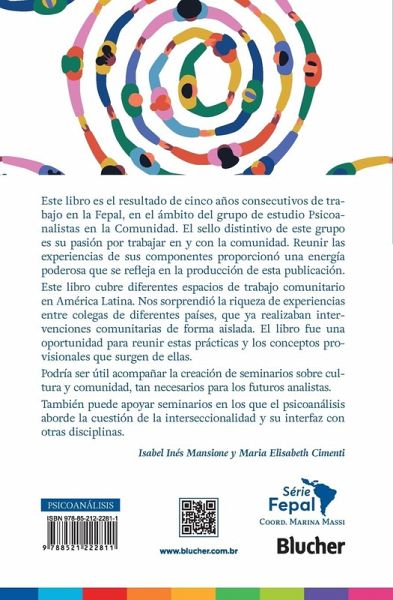 Este libro es el resultado de cinco años consecutivos de trabajo en la Fepal, en el ámbito del grupo de estudio Psicoanalistas en la Comunidad. El sello distintivo de este grupo es su pasión por trabajar en y con la comunidad. Reunir las experiencias de sus componentes proporcionó una energía poderosa que se refleja en la producción de esta publicación. Este libro cubre diferentes espacios de trabajo comunitario en América Latina. Nos sorprendió la riqueza de experiencias entre colegas de diferentes países, que ya realizaban intervenciones comunitarias de forma aislada. El libro fue una oportunidad para reunir estas prácticas y los conceptos provisionales que surgen de ellas. Podría ser útil acompañar la creación de seminarios sobre cultura y comunidad, tan necesarios para los futuros analistas. También puede apoyar seminarios en los que el psicoanálisis aborde la cuestión de la interseccionalidad y su interfaz con otras disciplinas. - Isabel Mansione y Maria Elisabeth Cimenti
