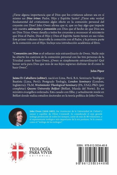 ¿Tiene alguna importancia que el Dios que los cristianos adoran sea en sí mismo un Dios trino: Padre, Hijo y Espíritu Santo? ¿Tiene esta verdad fundamental del cristianismo algún efecto en la comunión personal del creyente con Dios? John Owen afirma que sí, que no hay algo que impacte más nuestra adoración y comunión con Dios que el hecho de que Dios sea un Dios Trino. Owen desafía a todos los creyentes a reconocer el ministerio que Dios el Padre, Dios el Hijo y Dios el Espíritu Santo tienen en sus vidas. Este primer volumen desarrolla la comunión con el Padre, y la primera parte de la comunión con el Hijo. Incluye una introducción académica al libro. "He aquí una edición para el lector moderno de una obra puritana clásica de un autor puritano clásico. Se trata de un poderoso retrato trinitario a partir de las Escrituras de la verdad de que la comunión con Dios es y debe ser siempre la historia interior de la vida del verdadero cristiano. John Owen es un profundo maestro en todos los aspectos de la vida espiritual, y es una alegría acoger esta reaparición de uno de sus mejores logros." J. I. Packer, profesor de teología del Board of Governors, Regent College "Comunión con Dios es el esfuerzo más extraordinario de Owen. Nadie más ha abierto los caminos de la comunión personal con las tres personas de la Trinidad como lo hace Owen. ¡Owen es simplemente extraordinario! Qué honor sería para Dios que más de sus hijos supieran disfrutar de él como lo hace Owen". John Piper "Owen no es para los débiles de corazón ni para los impacientes ni para los perezosos. Pero para aquellos que quieran profundizar en la comprensión de la grandeza de Dios y de cómo caminamos con él, este libro compensará, muchas veces, el esfuerzo que requiere su lectura." David F. Wells, profesor distinguido de teología histórica y sistemática Andrew Mutch, Seminario Teológico Gordon-Conwell "Este es el momento oportuno para una reedición de la gran obra de John Owen. Hay un renovado interés en la Trinidad en estos días, y también hay una profunda hambre de espiritualidad genuina. Owen combina las dos cosas de manera poderosa, señalando el camino hacia una relación vital con el Dios trino. Es bueno tener este clásico disponible". Richard J. Mouw, presidente; profesor de filosofía cristiana, Seminario Fuller Sobre los autores: John Owen (1616-1683), fue vicerrector de la Universidad de Oxford y asesor y capellán de Oliver Cromwell. Es considerado el más grande teólogo protestante de todos los tiempos, autor de más de 80 volúmenes, y el representante teológico más importante de la era puritana. Se le conoce como el "teólogo de los teólogos". Jaime D. Caballero (editor), nació en Lima, Perú. B.A. Seminario Teológico Bautista (Lima, Perú); Postgrado Teología, London Seminary (Londres, Inglaterra); Th.M. Westminster Theological Seminary (PA, USA); PhD. (por completar) Queens University Belfast (Belfast, Irlanda del Norte). Es un ministro evangélico ordenado. Está casado con Ellie, y actualmente reside en Belfast donde realiza estudios doctorales en la teoría política de John Owen.