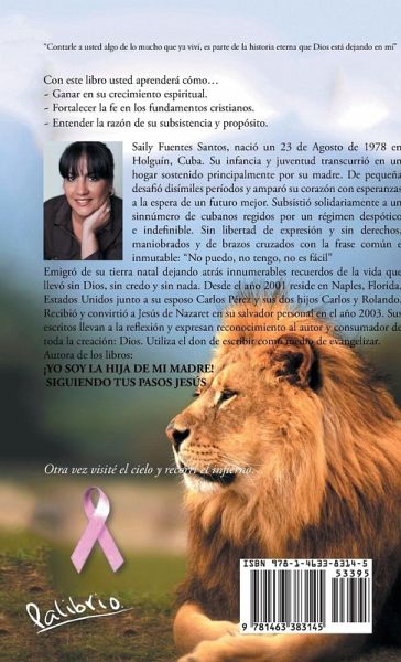 "Contarle a usted algo de lo mucho que ya viví, es parte de la historia eterna que Dios está dejando en mí" Con este libro usted aprenderá cómo... ~ Ganar en su crecimiento espiritual. ~ Fortalecer la fe en los fundamentos cristianos. ~ Entender la razón de su subsistencia y propósito. Saily Fuentes Santos, nació un 23 de Agosto de 1978 en Holguín, Cuba. Su infancia y juventud transcurrió en un hogar sostenido principalmente por su madre. De pequeña desafió disímiles períodos y amparó su corazón con esperanzas a la espera de un futuro mejor. Subsistió solidariamente a un sinnúmero de cubanos regidos por un régimen despótico e indefinible .Sin libertad de expresión y sin derechos, maniobrados y de brazos cruzados con la frase común e inmutable: "No puedo, no tengo, no es fácil" Emigró de su tierra natal dejando atrás innumerables recuerdos de la vida que llevó sin Dios, sin credo y sin nada. Desde el año 2001 reside en Naples, Florida, Estados Unidos junto a su esposo Carlos Pérez y sus dos hijos Carlos y Rolando. Recibió y convirtió a Jesús de Nazaret en su salvador personal en el año 2003. Sus escritos llevan a la reflexión y expresan reconocimiento al autor y consumador de toda la creación: Dios. Utiliza el don de escribir como medio de evangelizar. Autora de los libros: ¡YO SOY LA HIJA DE MI MADRE! SIGUIENDO TUS PASOS JESÚS Otra vez visité el cielo y recorrí el infierno... Tomada de Su mano, con la fuerza del Gran Yo Soy comprendí que: ¡Todo es posible!