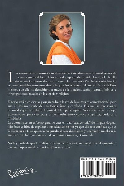 La autora de este manuscrito describe su entendimiento personal acerca de la sumisión total hacia Dios en todo aspecto de su vida. En el, ella detalla experiencias personales para mostrar la manifestación de esta obediencia, así como también comparte ideas e inspiraciones acerca del conocimiento de Dios mismo, que ella ha descubierto a través de la oración, sueños, estudio bíblico e investigaciones basadas en la ciencia y religión. El texto está bien escrito y organizado, y la voz de la autora es conversacional pero aun así mismo escribe de una forma fi rme y confi ada. Ella usa las revelaciones personales que ha recibido de parte de Dios para impartir Su carácter y Su mensaje, expresamente para ésta era y así estimular tanto como a creyentes, dudosos e incrédulos. La autora hace un esfuerzo para no caer en una "caja cerrada" de ningún dogma. Mas bien es libre de explorar otras ideas sin temor ya que ella está confi ada que es El Espíritu de Dios quien la ha guiado al descubrimiento y una visión mucha más amplia - con los ojos abiertos - de un Dios Cósmico y Universal. No hay duda de que la audiencia de esta autora será conmovida por el contenido, y estará impresionada y motivada por este libro.