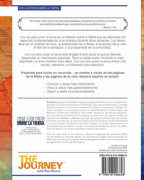Con los pies sobre la tierra es un estudio sobre la Biblia que ha explorado los aspectos fundamentales de la fe cristiana durante doce semanas. Los temas abarcan el carácter de Dios, la autenticidad de la Biblia, el propósito de la vida, el don de la salvación, y la prosperidad en la comunidad. Con los pies sobre la tierra está dirigido a todo aquel al que le interese desarrollar su crecimiento espiritual. Tanto si estás recién iniciando tu viaje espiritual o si eres cristiano hace años, Con los pies sobre la tierra ofrece una verdad, sabiduría, y motivación para descubrir. Prepárate para iniciar un recorrido... un camino a través de las páginas de la Biblia y las páginas de tu vida. Nuestro objetivo es simple: ¿ Conocer a Jesús más íntimamente. ¿ Amar a Jesús más apasionadamente. ¿ Seguir a Jesús incondicionalmente.
