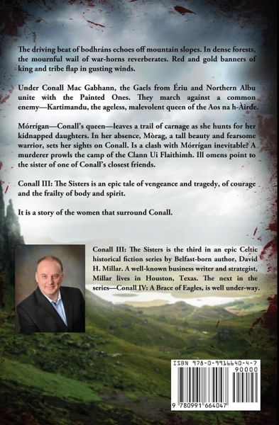 It is 406 B.C. The Gaels tramp through the vast forests of lowland Scotland, cross the brooding moors and marshes of the Pennines, and plough the grain fields of the South. The majestic stone brochs and dùns of the north give way to the great hillforts of the south. Cloaked in a rich tapestry of tattoos or wearing armour inlaid with iron scales, the Gaels stand as one, taunting their enemies with fierce battle-cries and insults. In Conall III: The Sisters-the third book of the Conall series-the women take centre stage. Brighid and Danu are kidnapped on the orders of Kartimandu, a malevolent queen bent on conquering the North. Mórrígan and Conall's blood oath promises no quarter until the young twins are returned. Will Eachdonn Breac, betrayed by his queen-Ceana, redeem his honour on the battlefield? A merciless assassin stalks the community. Tadhg Ó Cuileannáin is given the unenviable task of tracking the killer down. A mission made worse, when the signs point to the sister of one of Conall's closest friends. Amid, the battles and intrigue, Mòrag Ni Artair, a tall beauty and fearsome warrior, sets her sights on Conall. A clash with Mórrígan-Conall's queen, appears inevitable.