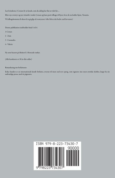 Lær kvinderne i Conans liv at kende, som du aldrig har fået at vide før ... Efter nye eventyr og nye triumfer vender Conan og hans parti tilbage til byen, hvor de nu kalder hjem, Tarantia. Vil tilbagekomsten få dem til at gå glip af eventyrene? eller bliver det bedre end forventet? Denne publikation indeholder bind 1 til 4: 1-Conan 2 - Zula 3 - Cassandra 4 - Valerie Ny serie baseret på Robert E. Howards værker. (Alle karakterer er 18 år eller ældre) Bemærkning om forfatteren: Erika Sanders er en internationalt kendt forfatter, oversat til mere end tyve sprog, som signerer sine mest erotiske skrifter, langt fra sin sædvanlige prosa, med sit pigenavn.
