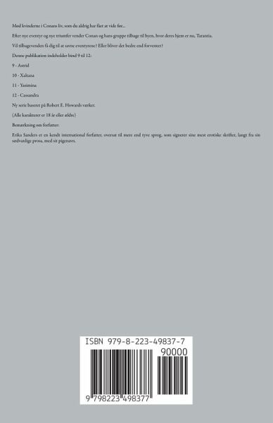 Mød kvinderne i Conans liv, som du aldrig har fået at vide før... Efter nye eventyr og nye triumfer vender Conan og hans gruppe tilbage til byen, hvor deres hjem er nu, Tarantia. Vil tilbagevenden få dig til at savne eventyrene? Eller bliver det bedre end forventet? Denne publikation indeholder bind 9 til 12: 9 - Astrid 10 - Xaltana 11 - Yasimina 12 - Cassandra Ny serie baseret på Robert E. Howards værker. (Alle karakterer er 18 år eller ældre) Bemærkning om forfatter: Erika Sanders er en kendt international forfatter, oversat til mere end tyve sprog, som signerer sine mest erotiske skrifter, langt fra sin sædvanlige prosa, med sit pigenavn.