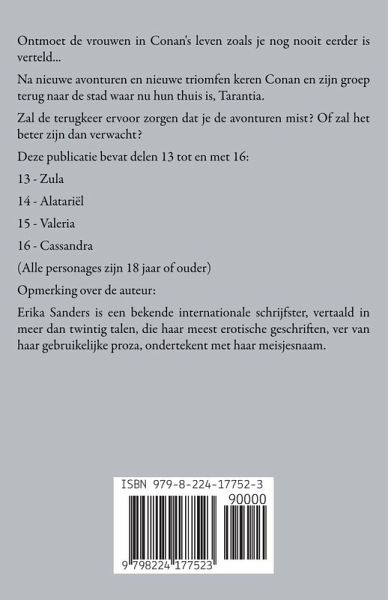 Ontmoet de vrouwen in Conan's leven zoals je nog nooit eerder is verteld... Na nieuwe avonturen en nieuwe triomfen keren Conan en zijn groep terug naar de stad waar nu hun thuis is, Tarantia. Zal de terugkeer ervoor zorgen dat je de avonturen mist? Of zal het beter zijn dan verwacht? Deze publicatie bevat delen 13 tot en met 16: 13 - Zula 14 - Alatariël 15 - Valeria 16 - Cassandra (Alle personages zijn 18 jaar of ouder) Opmerking over de auteur: Erika Sanders is een bekende internationale schrijfster, vertaald in meer dan twintig talen, die haar meest erotische geschriften, ver van haar gebruikelijke proza, ondertekent met haar meisjesnaam.