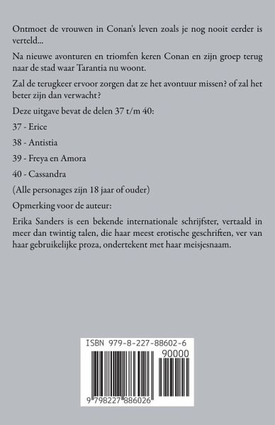 Ontmoet de vrouwen in Conan's leven zoals je nog nooit eerder is verteld... Na nieuwe avonturen en triomfen keren Conan en zijn groep terug naar de stad waar Tarantia nu woont. Zal de terugkeer ervoor zorgen dat ze het avontuur missen? of zal het beter zijn dan verwacht? Deze uitgave bevat de delen 37 t/m 40: 37 - Erice 38 - Antistia 39 - Freya en Amora 40 - Cassandra (Alle personages zijn 18 jaar of ouder) Opmerking voor de auteur: Erika Sanders is een bekende internationale schrijfster, vertaald in meer dan twintig talen, die haar meest erotische geschriften, ver van haar gebruikelijke proza, ondertekent met haar meisjesnaam.