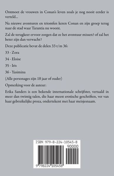 Ontmoet de vrouwen in Conan's leven zoals je nog nooit eerder is verteld... Na nieuwe avonturen en triomfen keren Conan en zijn groep terug naar de stad waar Tarantia nu woont. Zal de terugkeer ervoor zorgen dat ze het avontuur missen? of zal het beter zijn dan verwacht? Deze publicatie bevat de delen 33 t/m 36: 33 - Zora 34 - Eloise 35 - Iris 36 - Yasimina (Alle personages zijn 18 jaar of ouder) Opmerking voor de auteur: Erika Sanders is een bekende internationale schrijfster, vertaald in meer dan twintig talen, die haar meest erotische geschriften, ver van haar gebruikelijke proza, ondertekent met haar meisjesnaam.