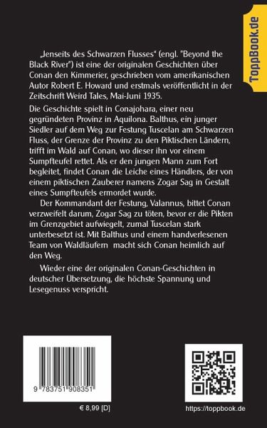"Jenseits des Schwarzen Flusses" (engl. "Beyond the Black River") ist eine der originalen Geschichten über Conan den Kimmerier, geschrieben vom amerikanischen Autor Robert E. Howard und erstmals veröffentlicht in der Zeitschrift Weird Tales, Mai-Juni 1935.Die Geschichte spielt in Conajohara, einer neu gegründeten Provinz in Aquilona. Balthus, ein junger Siedler auf dem Weg zur Festung Tuscelan am Schwarzen Fluss, der Grenze der Provinz zu den Piktischen Ländern, trifft im Wald auf Conan, wo dieser ihn vor einem Sumpfteufel rettet. Als er den jungen Mann zum Fort begleitet, findet Conan die Leiche eines Händlers, der von einem piktischen Zauberer namens Zogar Sag in Gestalt eines Sumpfteufels ermordet wurde.Der Kommandant der Festung, Valannus, bittet Conan verzweifelt darum, Zogar Sag zu töten, bevor er die Pikten im Grenzgebiet aufwiegelt, zumal Tuscelan stark unterbesetzt ist. Mit Balthus und einem handverlesenen Team von Waldläufern macht sich Conan heimlich auf den Weg. Wieder eine der originalen Conan-Geschichten in deutscher Übersetzung, die höchste Spannung und Lesegenuss verspricht.