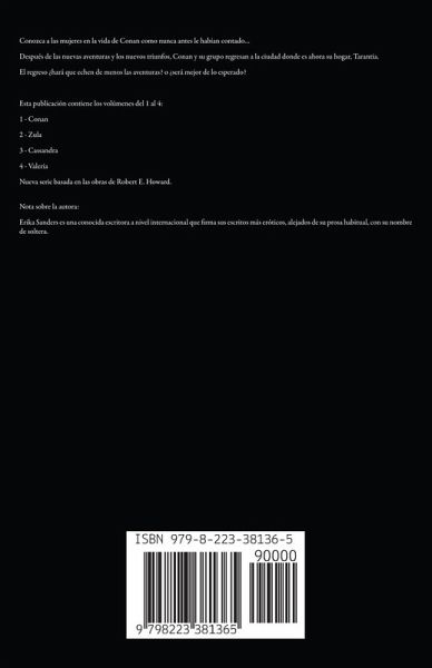Conozca a las mujeres en la vida de Conan como nunca antes le habían contado… Después de las nuevas aventuras y los nuevos triunfos, Conan y su grupo regresan a la ciudad donde es ahora su hogar, Tarantia. El regreso ¿hará que echen de menos las aventuras? o ¿será mejor de lo esperado? Esta publicación contiene los volúmenes del 1 al 4: 1 - Conan 2 - Zula 3 - Cassandra 4 - Valeria Nueva serie basada en las obras de Robert E. Howard. Nota sobre la autora: Erika Sanders es una conocida escritora a nivel internacional que firma sus escritos más eróticos, alejados de su prosa habitual, con su nombre de soltera.