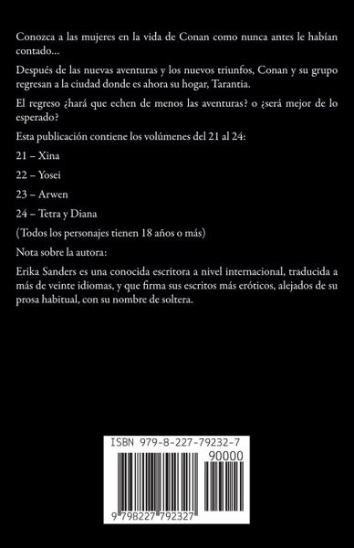 Conozca a las mujeres en la vida de Conan como nunca antes le habían contado... Después de las nuevas aventuras y los nuevos triunfos, Conan y su grupo regresan a la ciudad donde es ahora su hogar, Tarantia. El regreso ¿hará que echen de menos las aventuras? o ¿será mejor de lo esperado? Esta publicación contiene los volúmenes del 21 al 24: 21 - Xina 22 - Yosei 23 - Arwen 24 - Tetra y Diana (Todos los personajes tienen 18 años o más) Nota sobre la autora: Erika Sanders es una conocida escritora a nivel internacional, traducida a más de veinte idiomas, y que firma sus escritos más eróticos, alejados de su prosa habitual, con su nombre de soltera.