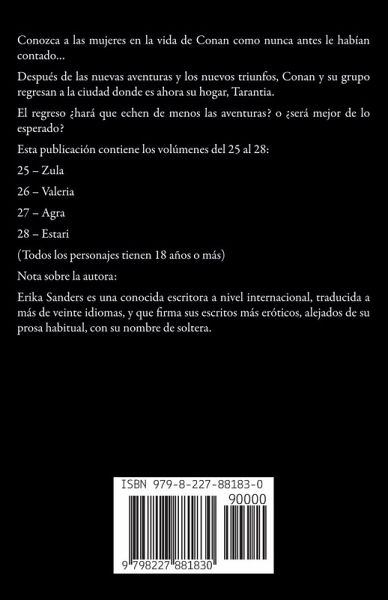 Conozca a las mujeres en la vida de Conan como nunca antes le habían contado... Después de las nuevas aventuras y los nuevos triunfos, Conan y su grupo regresan a la ciudad donde es ahora su hogar, Tarantia. El regreso ¿hará que echen de menos las aventuras? o ¿será mejor de lo esperado? Esta publicación contiene los volúmenes del 25 al 28: 25 - Zula 26 - Valeria 27 - Agra 28 - Estari (Todos los personajes tienen 18 años o más) Nota sobre la autora: Erika Sanders es una conocida escritora a nivel internacional, traducida a más de veinte idiomas, y que firma sus escritos más eróticos, alejados de su prosa habitual, con su nombre de soltera.