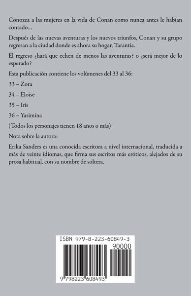 Conozca a las mujeres en la vida de Conan como nunca antes le habían contado... Después de las nuevas aventuras y los nuevos triunfos, Conan y su grupo regresan a la ciudad donde es ahora su hogar, Tarantia. El regreso ¿hará que echen de menos las aventuras? o ¿será mejor de lo esperado? Esta publicación contiene los volúmenes del 33 al 36: 33 - Zora 34 - Eloise 35 - Iris 36 - Yasimina (Todos los personajes tienen 18 años o más) Nota sobre la autora: Erika Sanders es una conocida escritora a nivel internacional, traducida a más de veinte idiomas, que firma sus escritos más eróticos, alejados de su prosa habitual, con su nombre de soltera.